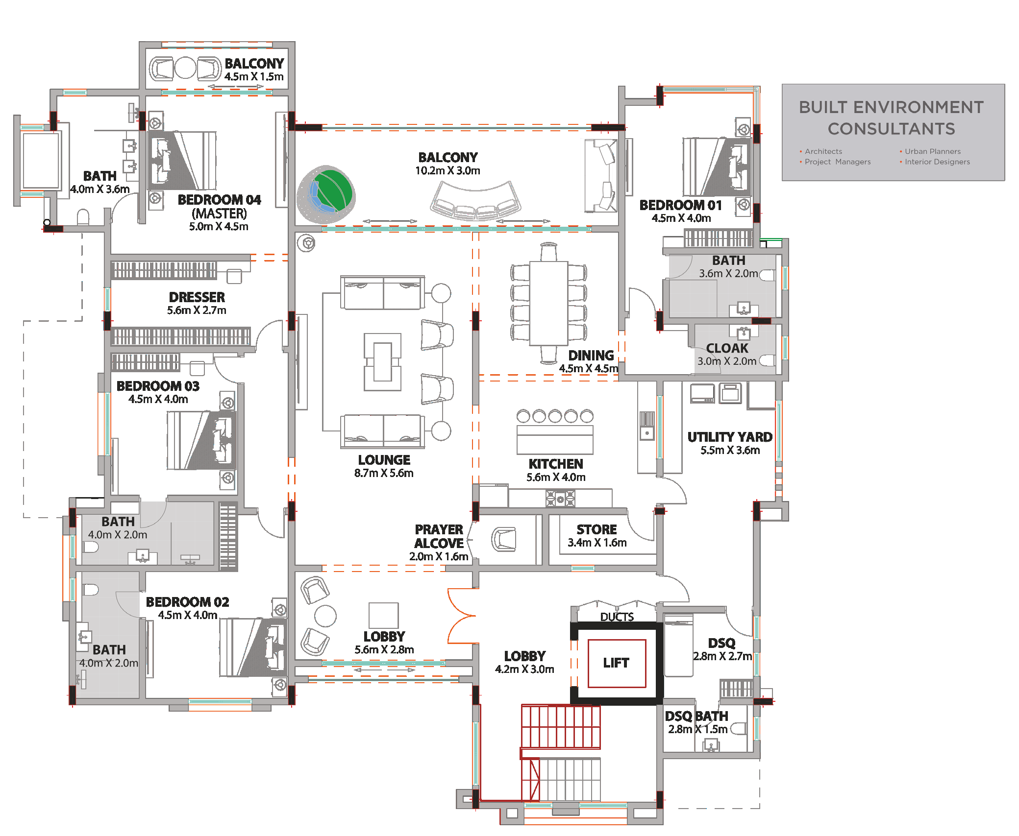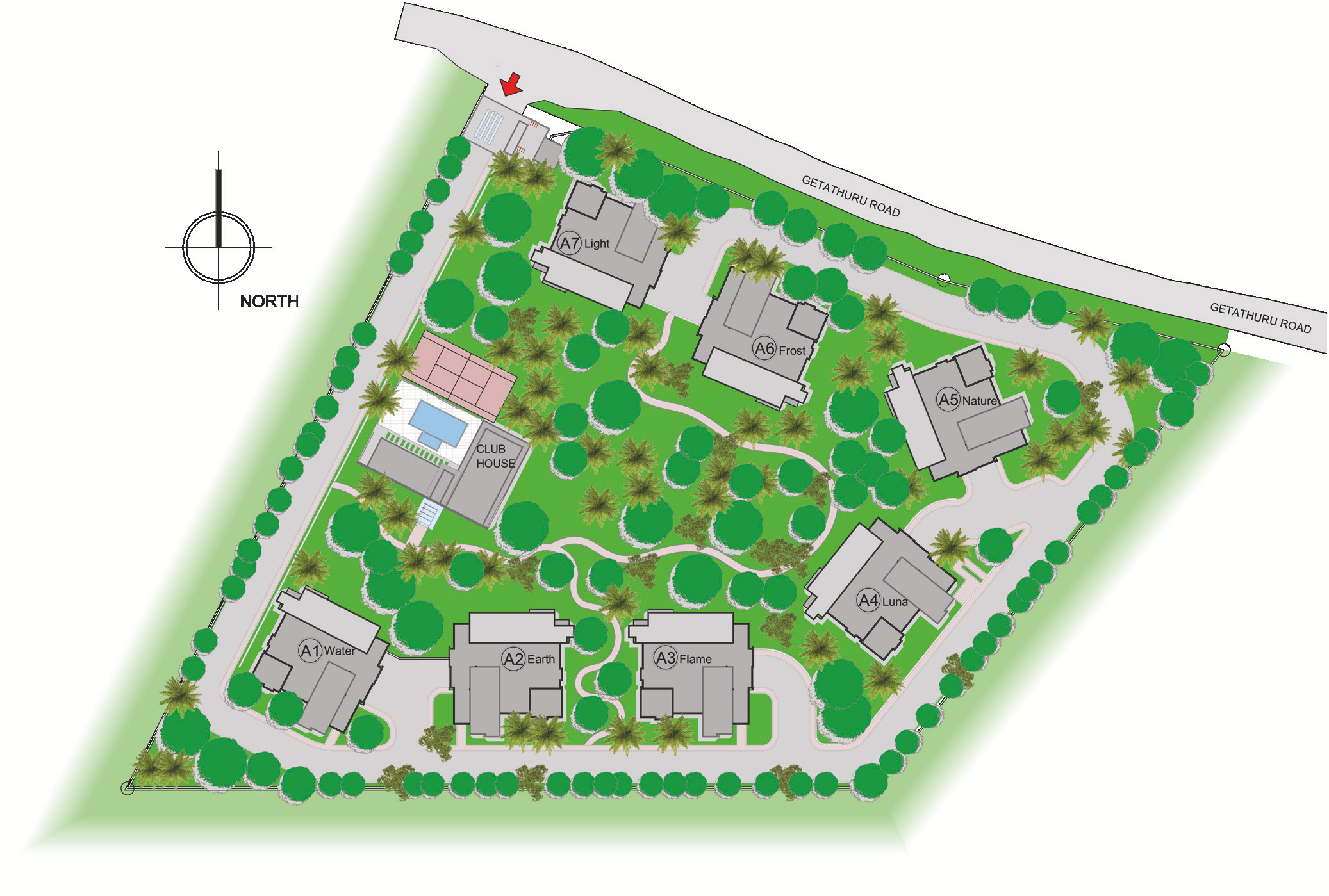 7 blocks in total, 4 floors above ground. One apartment on each floor with each block having a private elevator. The blocks are nestled amongst an enchanting population of indigenous trees to provide maximum privacy.